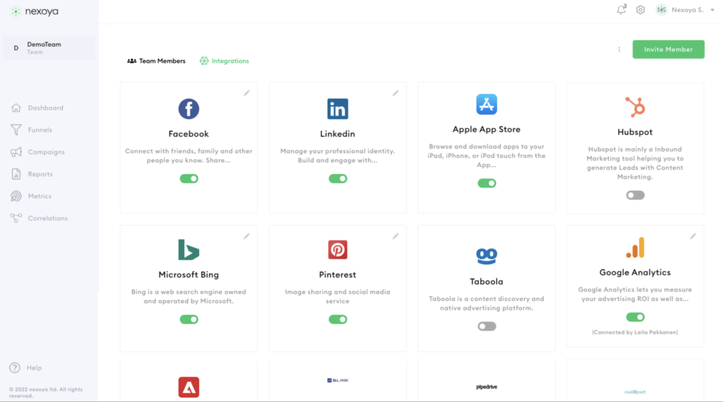 Bei den Paid Ads Integrationen hat Nexoya auch die Integration mit Taboola aufgenommen. Werbetreibende können über die Anzeigenplattform Display-Kampagnen weltweit auf den großen Publisher-Webseiten ausspielen. Weitere für Nexoya-Kunden derzeit integrierbare Paid Ads Plattformen sind Adition, Adunit, AppNexus, Bing Advertising von Microsoft, Display and Video 360, DoubleClick Campaign Manager, Google Ads, MediaMath, Meta Platforms, Smart Ad Server und Splicky.